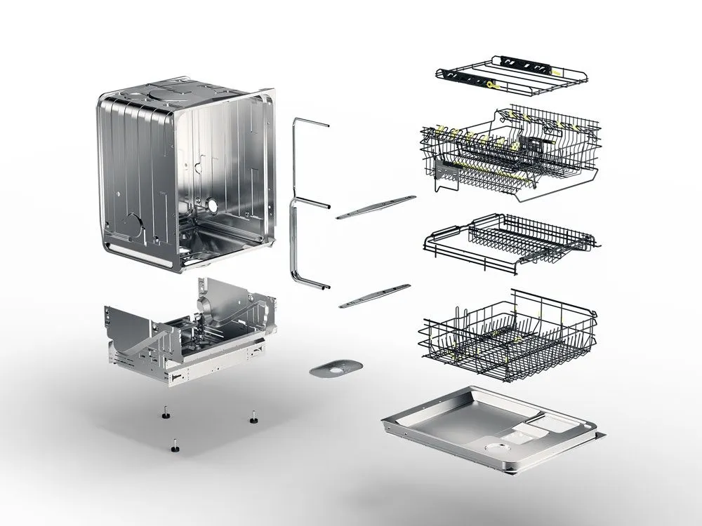 Žiadny iný materiál nevydrží to, čo oceľ. Osem najdôležitejších komponentov umývačky riadu vyrábame z vysokokvalitnej ocele a nie z plastu. Je to umývací kontajner, umývací kôš, ostrekovacie ramená, ostrekovacia trubica, sitá, vonkajšia základňa, nohy a ohrevné teleso.