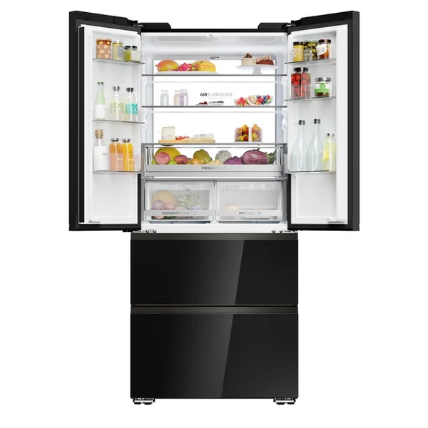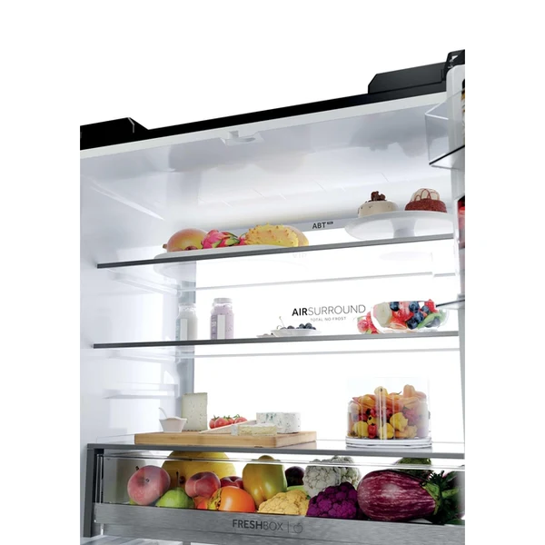 S technológiou Haier Air Surround Fresher Tech prúdi vzduch vo vnútri chladničky jemnejším a šetrnejším spôsobom. Vďaka špeciálnym bočným prieduchom, odkiaľ je vzduch šírený, distribuuje tento systém homogénne studený vzduch v celom priestore chladničky, čím sa zabráni priamemu fúkaniu na potraviny a strate hmotnosti a vysušeniu potravín. To je dôvod, prečo Haier Air Surround zachováva chuť, konzistenciu a šťavnatosť jedla až o 99 % po 7 dňoch ako v Deň 1.