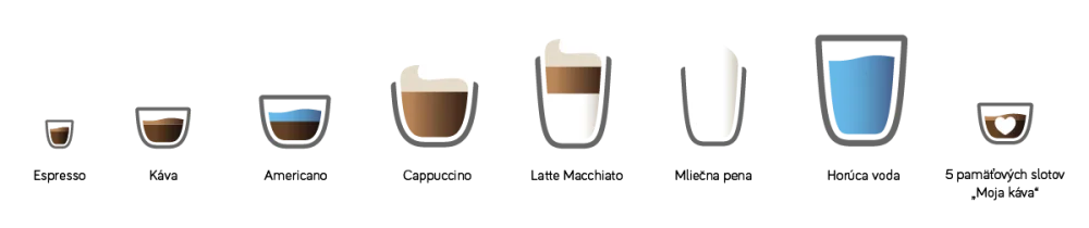 Druh nápoja Espresso | horúca voda | mliečna pena | káva | Americano | Cappuccino | Latte Macchiato | Flat white
